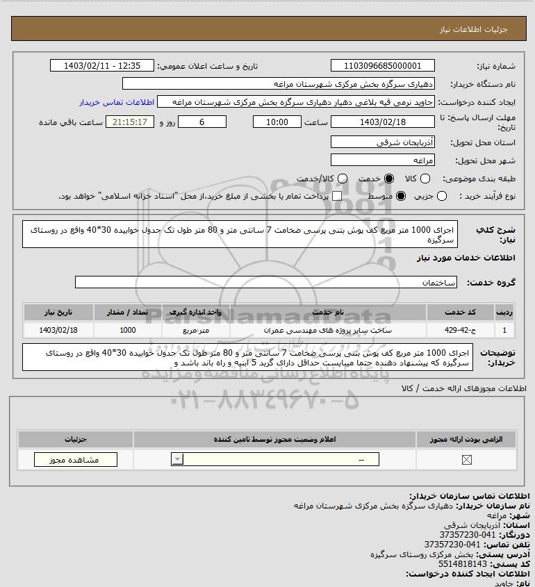 شرح کلی نیاز: اجرای 1000 متر مربع کف پوش بتنی پرسی ضخامت 7 سانتی متر و 80 متر طول تک جدول خوابیده 30*40 واقع در روستای سرگیزه