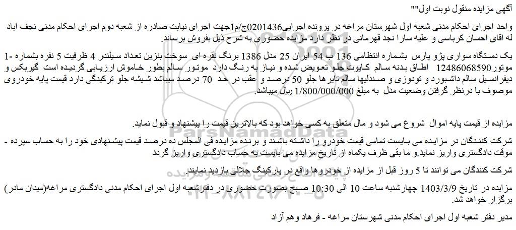 واحد اجرای احکام مدنی شعبه اول شهرستان مراغه در پرونده اجرایی0201436ج/م1جهت اجرای نیابت صادره از شعبه دوم اجرای احکام مدنی نجف اباد له اقای احسان کرباسی و علیه سارا نجد قهرمانی در نظر دارد مزایده حضوری به شرح ذیل بفروش برساند.