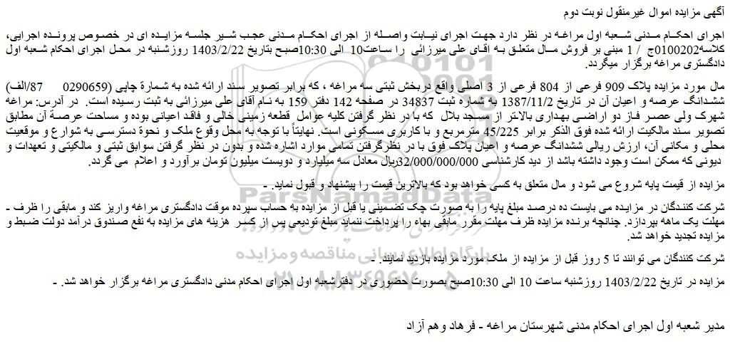 - مزایده در تاریخ 1403/2/22 روزشنبه ساعت 10 الی 10:30صبح بصورت حضوری در دفترشعبه اول اجرای احکام مدنی دادگستری مراغه برگزار خواهد شد.