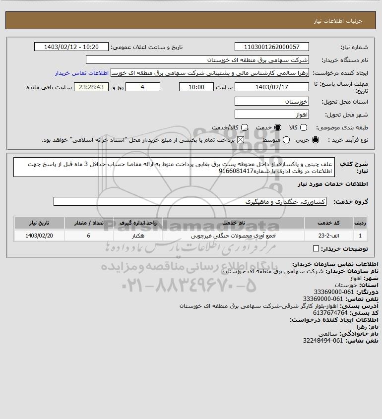 شرح کلی نیاز: علف چینی و پاکسازی از داخل محوطه پست برق بقایی پرداخت منوط به ارائه مفاصا حساب حداقل 3 ماه قبل از پاسخ جهت اطلاعات در وقت اداری با شماره9166081417