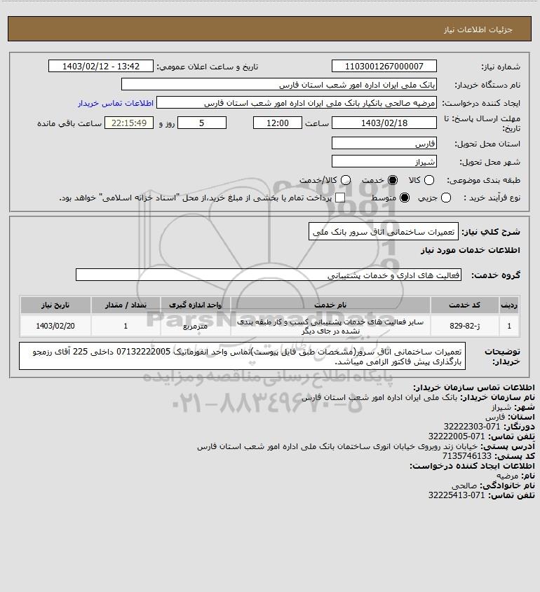 شرح کلی نیاز: تعمیرات ساختمانی اتاق سرور بانک ملی