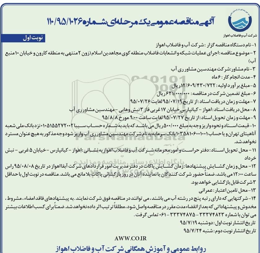 1- نام دستگاه مناقصه گزار: شرکت اب و فاضلاب اهواز