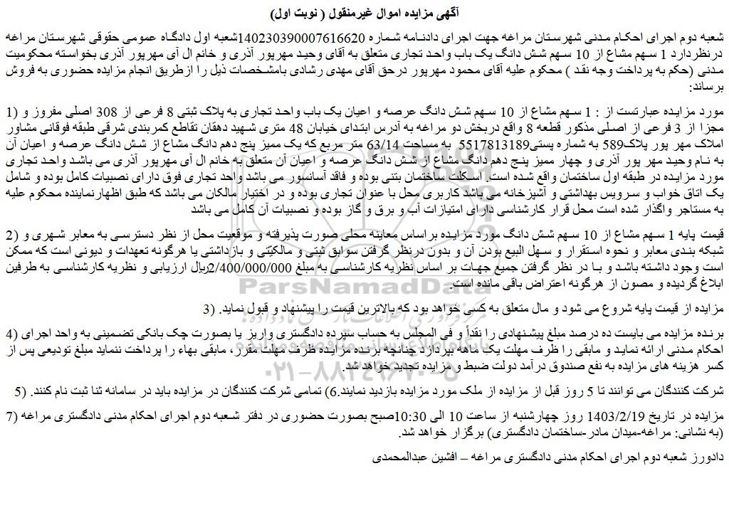 شعبه دوم اجرای احکام مدنی شهرستان مراغه جهت اجرای دادنامه شماره 140230390007616620شعبه اول دادگاه عمومی حقوقی شهرستان مراغه درنظردارد 1 سهم مشاع از 10 سهم شش دانگ یک باب واحد تجاری متعلق به آقای وحید مهرپور آذری و خانم ال آی مهرپور آذری بخواسته محکومیت مدنی (حکم به پرداخت وجه نقد ) محکوم علیه آقای محمود مهرپور درحق آقای مهدی رشادی بامشخصات ذیل را ازطریق انجام مزایده حضوری به فروش برساند: