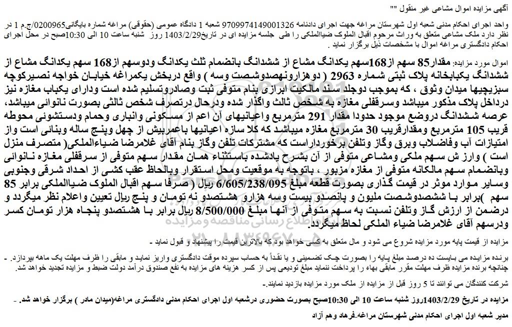واحد اجرای احکام مدنی شعبه اول شهرستان مراغه جهت اجرای دادنامه 9709974149001326 شعبه 1 دادگاه عمومی (حقوقی) مراغه شماره بایگانی0200965/ج.م 1 در نظر دارد ملک مشاعی متعلق به وراث مرحوم اقبال الملوک ضیاالملکی را طی جلسه مزایده ای در تاریخ1403/2/29 روز شنبه ساعت 10 الی 10:30صبح در محل اجرای احکام دادگستری مراغه اموال با مشخصات ذیل برگزار نماید .