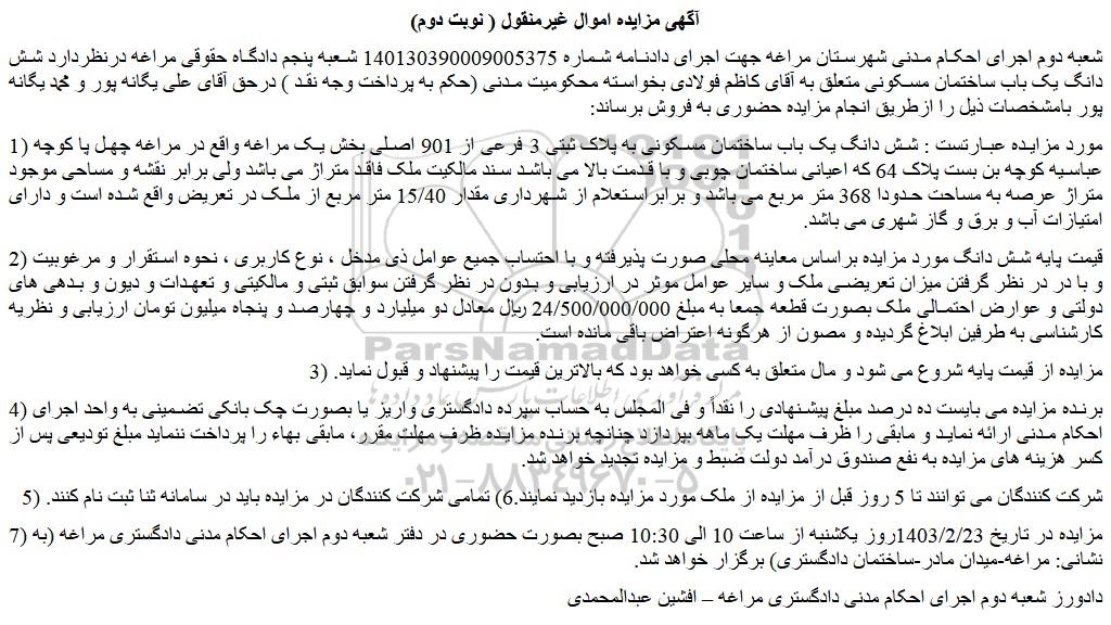 شعبه دوم اجرای احکام مدنی شهرستان مراغه جهت اجرای دادنامه شماره 140130390009005375 شعبه پنجم دادگاه حقوقی مراغه درنظردارد شش دانگ یک باب ساختمان مسکونی متعلق به آقای کاظم فولادی بخواسته محکومیت مدنی (حکم به پرداخت وجه نقد ) درحق آقای علی یگانه پور و محمد یگانه پور بامشخصات ذیل را ازطریق انجام مزایده حضوری به فروش برساند: