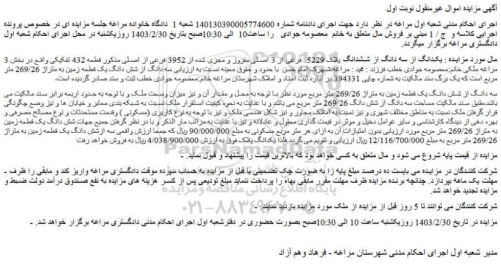 - مزایده در تاریخ 1403/2/30 روزیکشنبه ساعت 10 الی 10:30صبح بصورت حضوری در دفترشعبه اول اجرای احکام مدنی دادگستری مراغه برگزار خواهد شد.