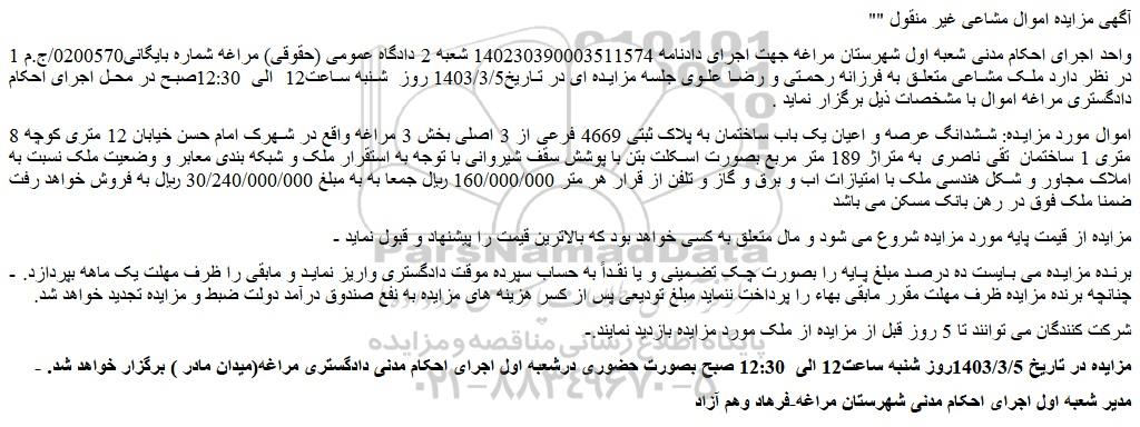واحد اجرای احکام مدنی شعبه اول شهرستان مراغه جهت اجرای دادنامه 140230390003511574 شعبه 2 دادگاه عمومی (حقوقی) مراغه شماره بایگانی0200570/ج.م 1 در نظر دارد ملک مشاعی متعلق به فرزانه رحمتی و رضا علوی جلسه مزایده ای در تاریخ1403/3/5 روز شنبه ساعت12 الی 12:30صبح در محل اجرای احکام دادگستری مراغه اموال با مشخصات ذیل برگزار نماید .