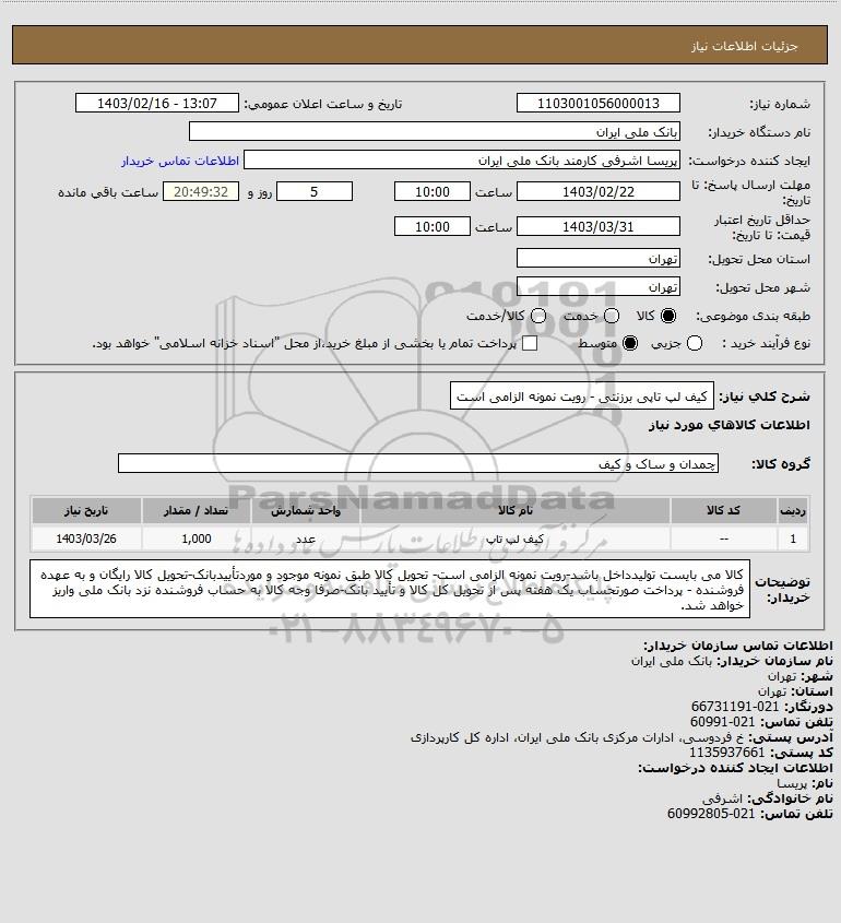 شرح کلی نیاز: کیف لپ تاپی برزنتی - رویت نمونه الزامی است