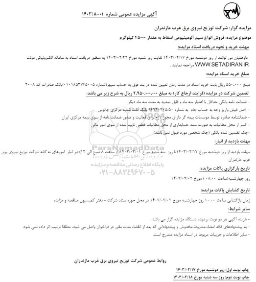 موضوع مزایده: فروش انواع سیم آلومینیومی اسقاط به مقدار 45000 کیلوگرم