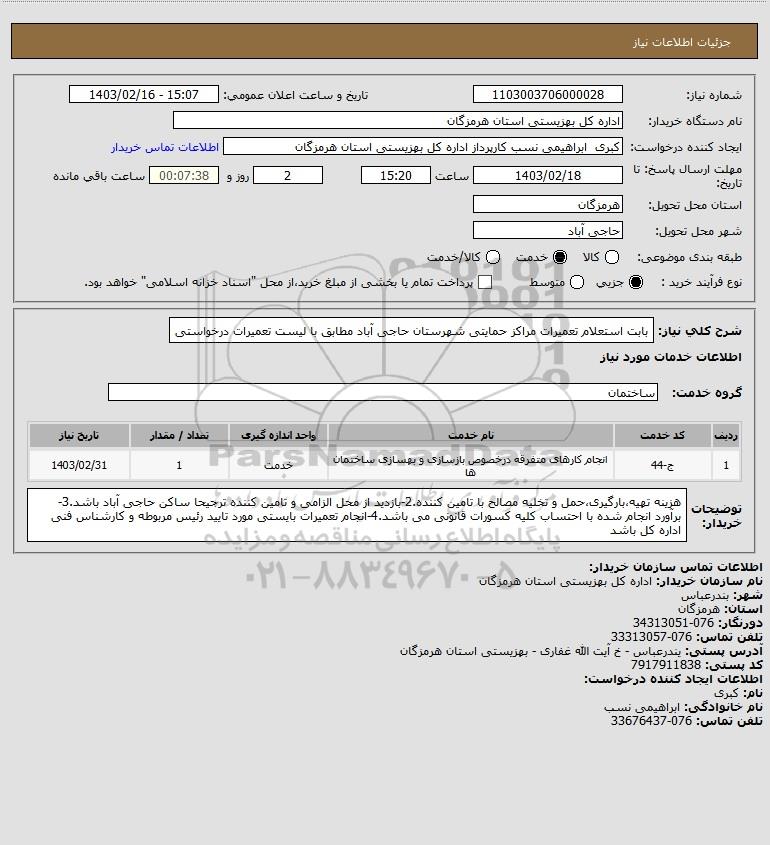 شرح کلی نیاز: بابت استعلام تعمیرات مراکز حمایتی شهرستان حاجی آباد مطابق با لیست تعمیرات درخواستی