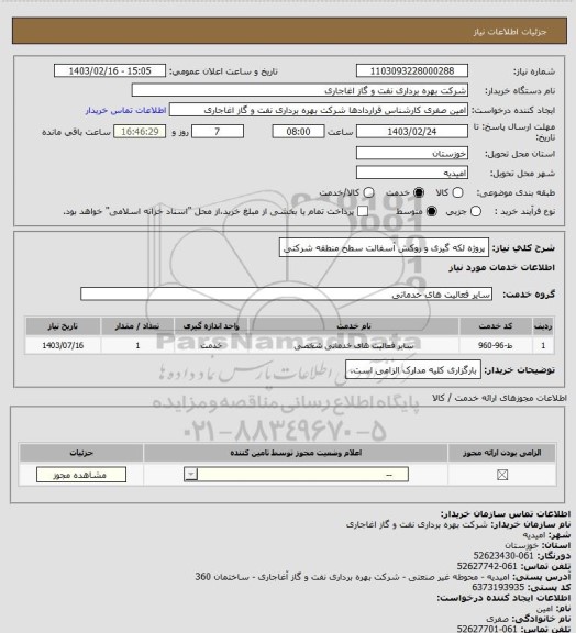 شرح کلی نیاز: پروژه لکه گیری و روکش آسفالت سطح منطقه شرکتی