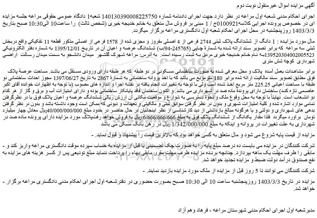 - مزایده در تاریخ 1403/3/3 روزپنجشنبه ساعت 10 الی 10:30 صبح بصورت حضوری در دفترشعبه اول اجرای احکام مدنی دادگستری مراغه برگزار خواهد شد.