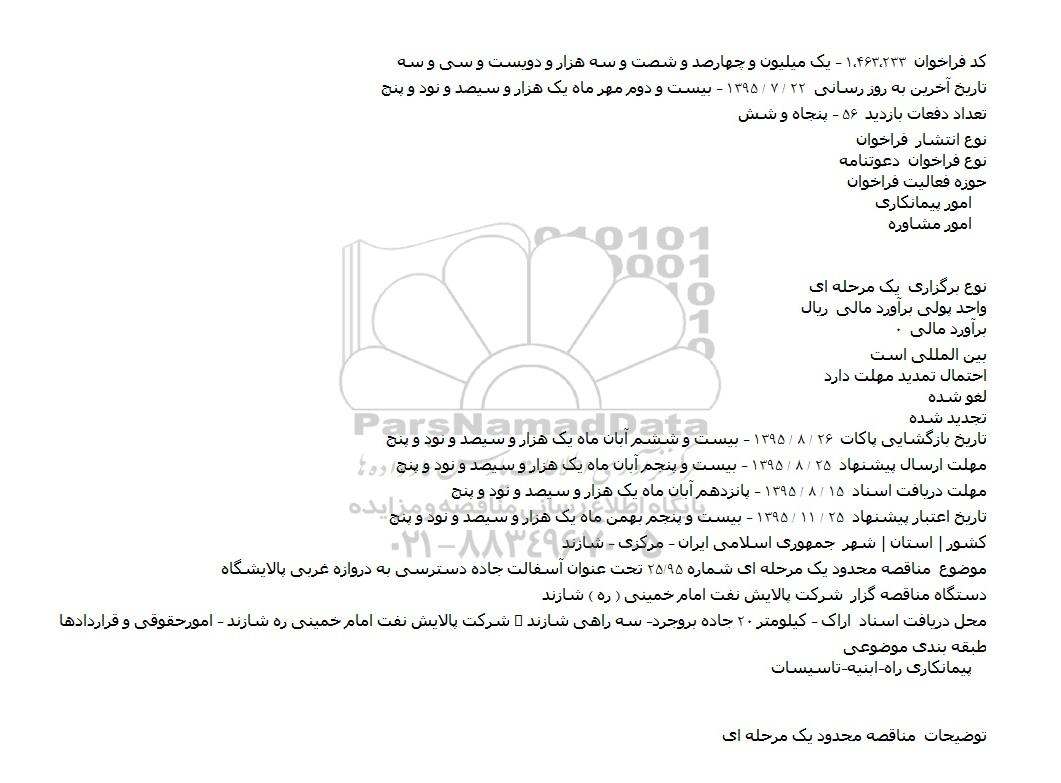 موضوع  مناقصه محدود یک مرحله ای شماره ۲۵/۹۵ تحت عنوان آسفالت جاده دسترسی به دروازه غربی پالایشگاه
