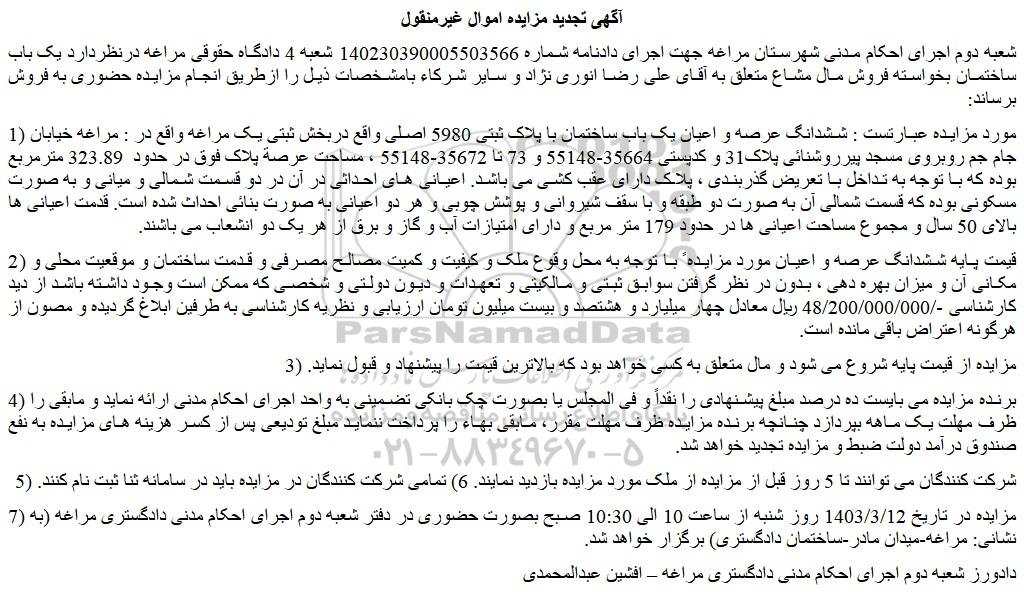 مزایده ششدانگ عرصه و اعیان یک باب ساختمان با پلاک ثبتی 5980 اصلی, مزایده ششدانگ عرصه و اعیان یک باب ساختمان با پلاک ثبتی 5980 اصلی