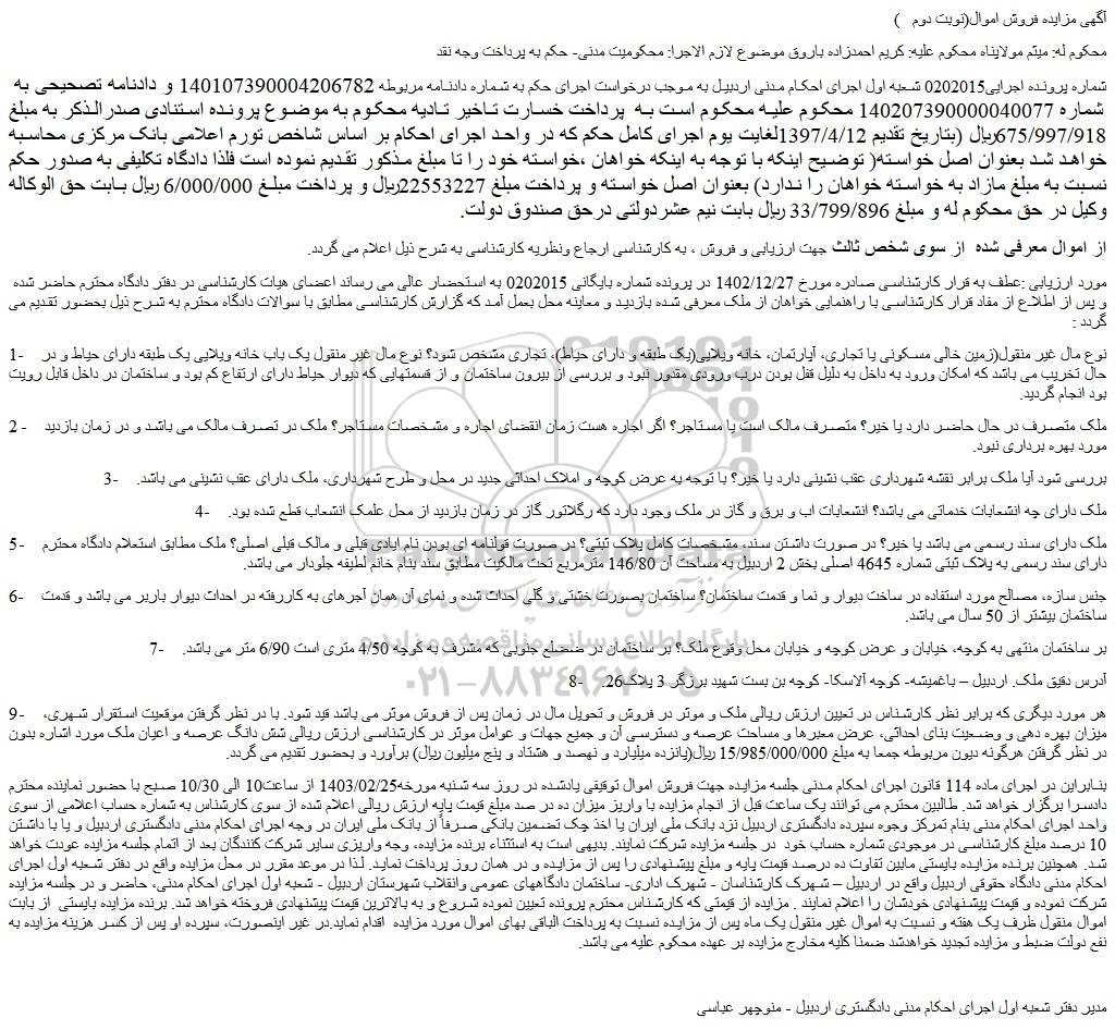 شماره پرونده اجرایی0202015 شعبه اول اجرای احکام مدنی اردبیل به موجب درخواست اجرای حکم به شماره دادنامه مربوطه 140107390004206782 و دادنامه تصحیحی به شماره 140207390000040077 محکوم علیه محکوم است به پرداخت خسارت تاخیر تادیه محکوم به موضوع پرونده استنادی صدرالذکر به مبلغ 675/997/918ریال (بتاریخ تقدیم 1397/4/12لغایت یوم اجرای کامل حکم که در واحد اجرای احکام بر اساس شاخص تورم اعلامی بانک مرکزی محاسبه خواهد شد بعنوان اصل خواسته( توضیح اینکه با توجه به اینکه خواهان ،خواسته خود را تا مبلغ مذکور تقدیم نموده است فلذا دادگاه تکلیفی به صدور حکم نسبت به مبلغ مازاد به خواسته خواهان را ندارد) بعنوان اصل خواسته و پرداخت مبلغ 22553227ریال و پرداخت مبلغ 6/000/000 ریال بابت حق الوکاله وکیل در حق محکوم له و مبلغ 33/799/896 ریال بابت نیم عشردولتی درحق صندوق دولت.