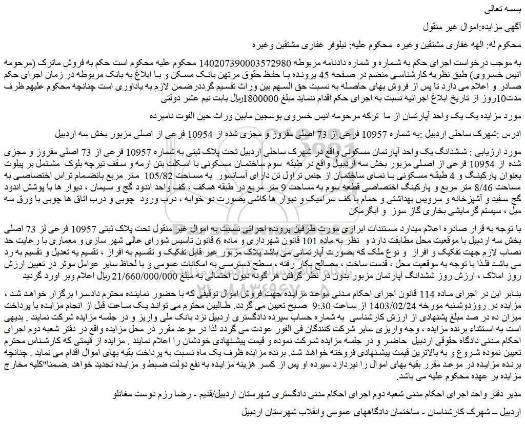 با توجه به قرار صادره اعلام میدارد مستندات ابرازی مورث طرفین پرونده اجرائی نسبت به اموال غیر منقول تحت پلاک ثبتی 10957 فرعی لز 73 اصلی بخش سه اردبیل با موقعیت محل مطابقت دارد و  نظر به ماده 101 قانون شهرداری و ماده 6 قانون تاسیس شورای عالی شهر سازی و معماری با رعایت حد نصاب لازم جهت تفکیک و افراز  و نوع ملک که بصورت آپارتمانی می باشد پلاک مزبور غیر قابل تفکیک و تقسیم به افراز ، تقسیم یه تعدیل و تقسیم به رد می باشد فلذا با توجه به موقعیت محل ، قدمت ساخت ، مصالح بکار رفته ، سطح دسترسی به امکانات عمومی و با لحاظ سایر عوامل موثر در تعیین ارزش روز املاک ، ارزش روز ششدانگ آپارتمان مزبور بدون در نظر گرفتن هر گونه دیون احتمالی به مبلغ 21/660/000/000 ریال اعلام وبر اورد گردید