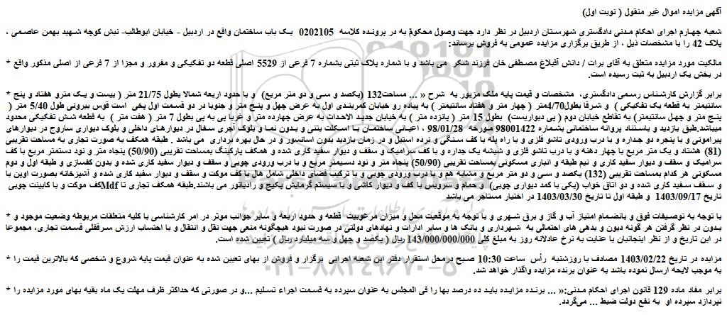 شعبه چهارم اجرای احکام مدنی دادگستری شهرستان اردبیل در نظر دارد جهت وصول محکومٌ به در پرونده کلاسه  0202105  یک باب ساختمان واقع در اردبیل - خیابان ابوطالب- نبش کوچه شهید بهمن عاصمی ، پلاک 42 را با مشخصات ذیل ، از طریق برگزاری مزایده عمومی به فروش برساند: