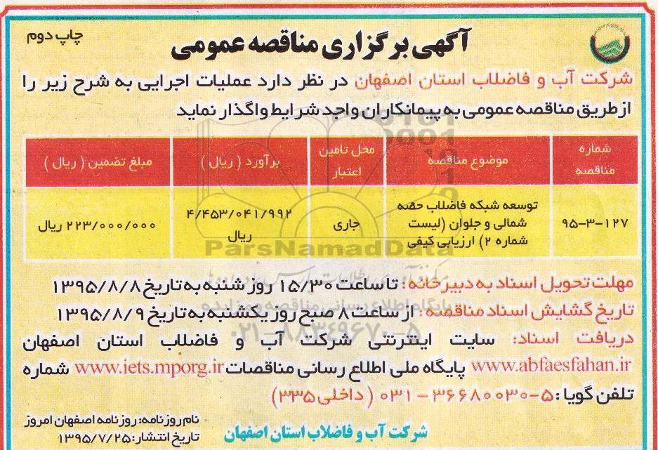 | 95-3-127 | توسعه شبکه فاضلاب حصه شمالی و جلوان (لیست شماره 2) ارزیابی کیفی |