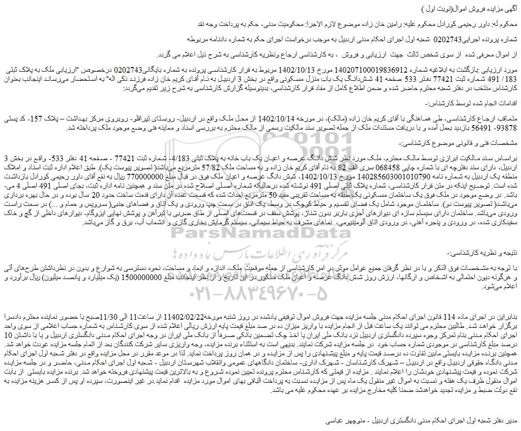 مورد ارزیابی :بازگشت به ابلاغیه شماره 140207100019836912 مورخ 1402/10/13 مربوط به قرار کارشناسی پرونده به شماره بایگانی0202743 درخصوص "ارزیابی ملک به پلاک ثبتی 183/ 491 شماره ثبت 77421 دفتر 533 صفحه 41 ششدانگ یک باب منزل مسکونی واقع در بخش 3 اردبیل به نام آقای کریم خان زاده فرزند ذکی اله" به استحضار میرساند اینجانب بعنوان کارشناس منتخب در دفتر شعبه محترم حاضر شده و ضمن اطلاع کامل از مفاد قرار کارشناسی، بدینوسیله گزارش کارشناسی به شرح زیر تقدیم میگردد: