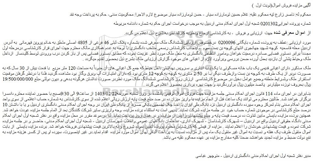 بنابراین در اجرای ماده 114 قانون اجرای احکام مدنی جلسه مزایده جهت فروش اموال توقیفی یادشده در روز شنبه  مورخه1403/02/22 از ساعت9 الی 9/30صبح با حضور نماینده محترم دادسرا برگزار خواهد شد. طالبین محترم می توانند یک ساعت قبل از انجام مزایده با واریز میزان ده در صد مبلغ قیمت پایه ارزش ریالی اعلام شده از سوی کارشناس به شماره حساب اعلامی از سوی واحد اجرای احکام مدنی بنام تمرکز وجوه سپرده دادگستری اردبیل نزد بانک ملی ایران یا اخذ چک تضمین بانکی صرفاً از بانک ملی ایران در وجه اجرای احکام مدنی دادگستری اردبیل و یا با داشتن 10 درصد مبلغ کارشناسی در موجودی شماره حساب خود  در جلسه مزایده شرکت نمایند. بدیهی است به استثناء برنده مزایده، وجه واریزی سایر شرکت کنندگان بعد از اتمام جلسه مزایده عودت خواهد شد. همچنین برنده مزایده بایستی مابین تفاوت ده درصد قیمت پایه و مبلغ پیشنهادی را پس از مزایده و در همان روز پرداخت نماید. لذا در موعد مقرر در محل مزایده واقع در دفتر شعبه اول اجرای احکام مدنی دادگاه حقوقی اردبیل واقع در اردبیل – شهرک کارشناسان - شهرک اداری- ساختمان دادگاههای عمومی وانقلاب شهرستان اردبیل - شعبه اول اجرای احکام مدنی، حاضر و در جلسه مزایده شرکت نموده و قیمت پیشنهادی خودشان را اعلام نمایند . مزایده از قیمتی که کارشناس محترم پرونده تعیین نموده شروع و به بالاترین قیمت پیشنهادی فروخته خواهد شد. برنده مزایده بایستی  از بابت اموال منقول ظرف یک هفته و نسبت به اموال غیر منقول یک ماه پس از مزایده نسبت به پرداخت الباقی بهای اموال مورد مزایده  اقدام نماید.در غیر اینصورت، سپرده او پس از کسر هزینه مزایده به نفع دولت ضبط و مزایده تجدید خواهدشد ضمنا کلیه مخارج مزایده بر عهده محکوم علیه می باشد.