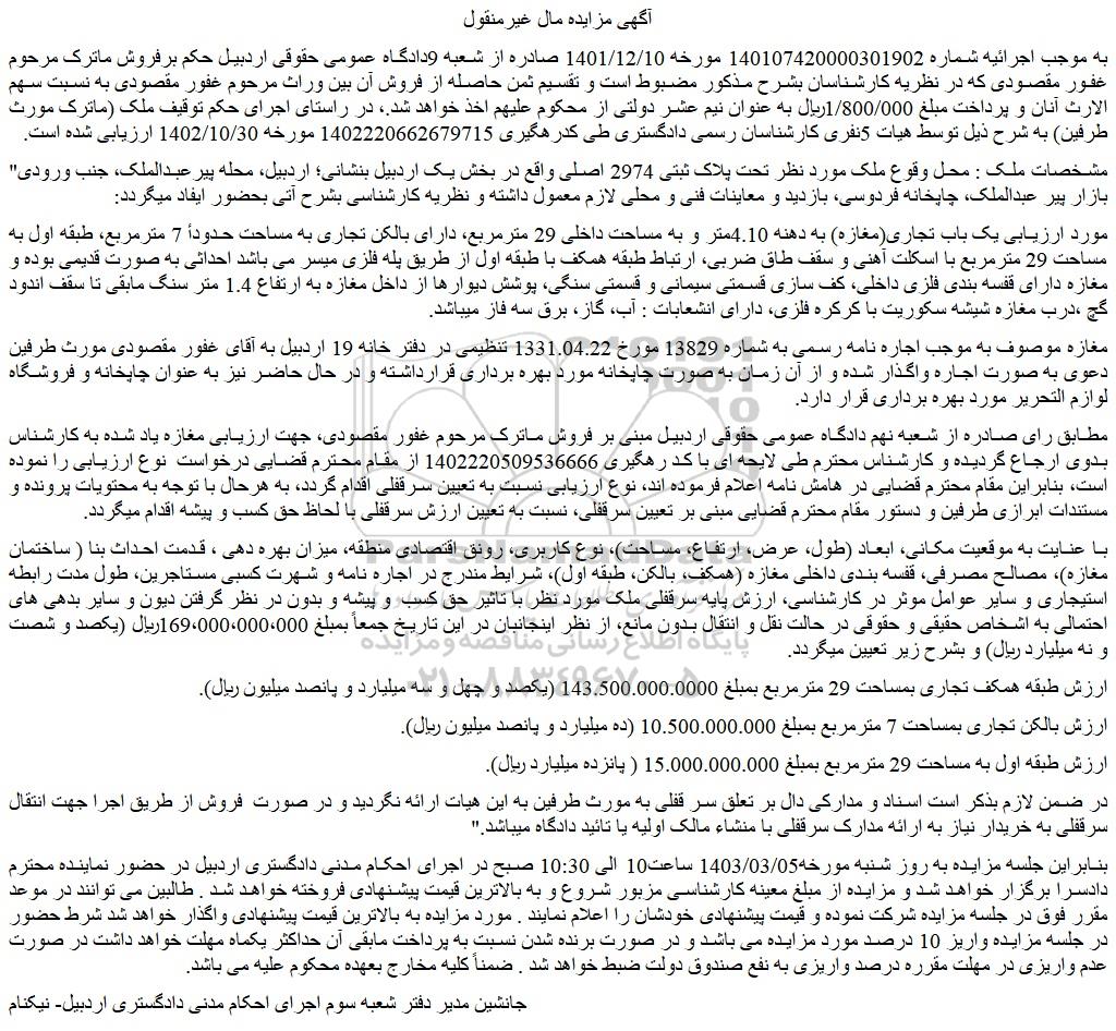 به موجب اجرائیه شماره 140107420000301902 مورخه 1401/12/10 صادره از شعبه 9دادگاه عمومی حقوقی اردبیل حکم برفروش ماترک مرحوم غفور مقصودی که در نظریه کارشناسان بشرح مذکور مضبوط است و تقسیم ثمن حاصله از فروش آن بین وراث مرحوم غفور مقصودی به نسبت سهم الارث آنان و پرداخت مبلغ 1/800/000ریال به عنوان نیم عشر دولتی از محکوم علیهم اخذ خواهد شد.، در راستای اجرای حکم توقیف ملک (ماترک مورث طرفین) به شرح ذیل توسط هیات 5نفری کارشناسان رسمی دادگستری طی کدرهگیری 1402220662679715 مورخه 1402/10/30 ارزیابی شده است.