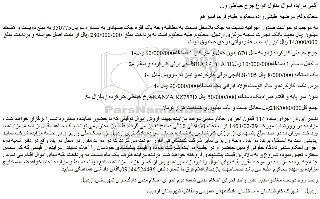 آگهی مزایده اموال منقول انواع چرخ خیاطی و...