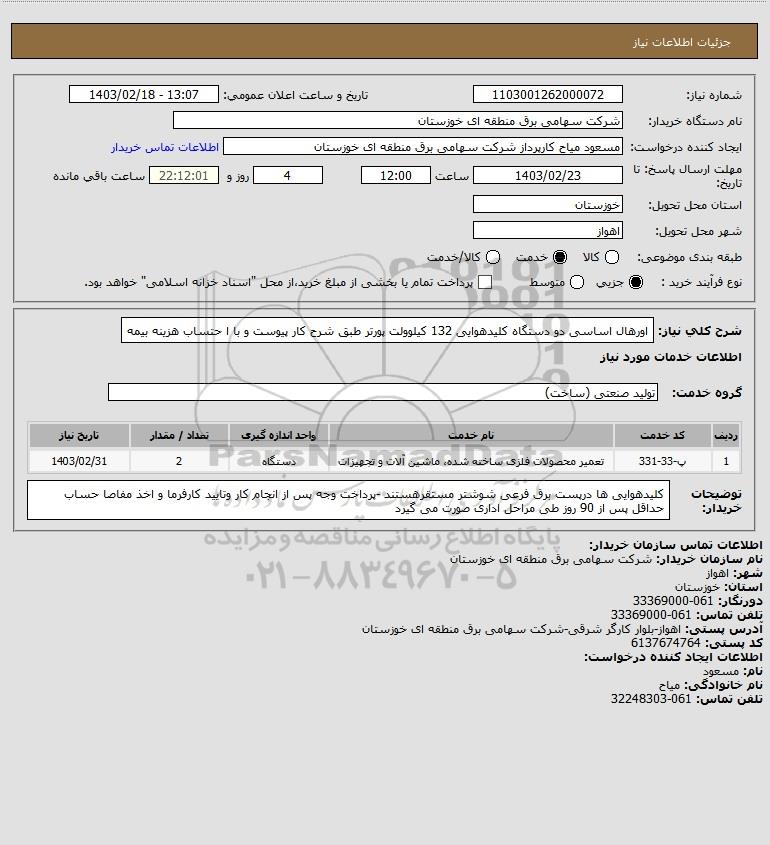 شرح کلی نیاز: اورهال اساسی دو دستگاه کلیدهوایی 132 کیلوولت پورتر طبق شرح کار پیوست و با ا حتساب هزینه بیمه