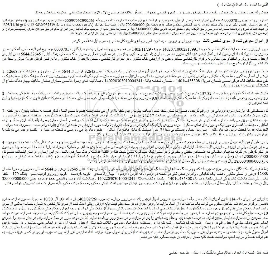 باطلاع شرکت کنندگان محترم در مزایده میرساند که چهار دانگ مشاع از ششدانگ عرصه و اعیان آپارتمان مسکونی ، بشماره پلاک ثبتی 32645 فرعی از 5644 اصلی ، مفروز و مجزا شده از 12668 فرعی از اصلی مذکور ، قطعه یک تفکیکی ، واقع در بخش ثبتی دو منطقه دو اردبیل ، به آدرس ؛ اردبیل – چهارراه سعدی – کوچه کرداحمد – کوچه روبروی تربیت معلم – پلاک 179 – طبقه یک ، طی سند مالکیت تک برگی اصلی بشماره سریال 435308ب1401 ، بشماره شناسه یکتا : 140220303010004241 ، بمالکیت آقای رسول قاسمی حجاران بوده  بمبلغ 28/000/000/000 ریال (بیست و هشت میلیارد ریال معادل دو میلیارد و هشتصد میلیون تومان) برآورد شده و از سوی ایشان جهت پرداخت  الباقی محکوم به محکومیت محکوم علیه معرفی شده است بفروش خواهد رفت .
