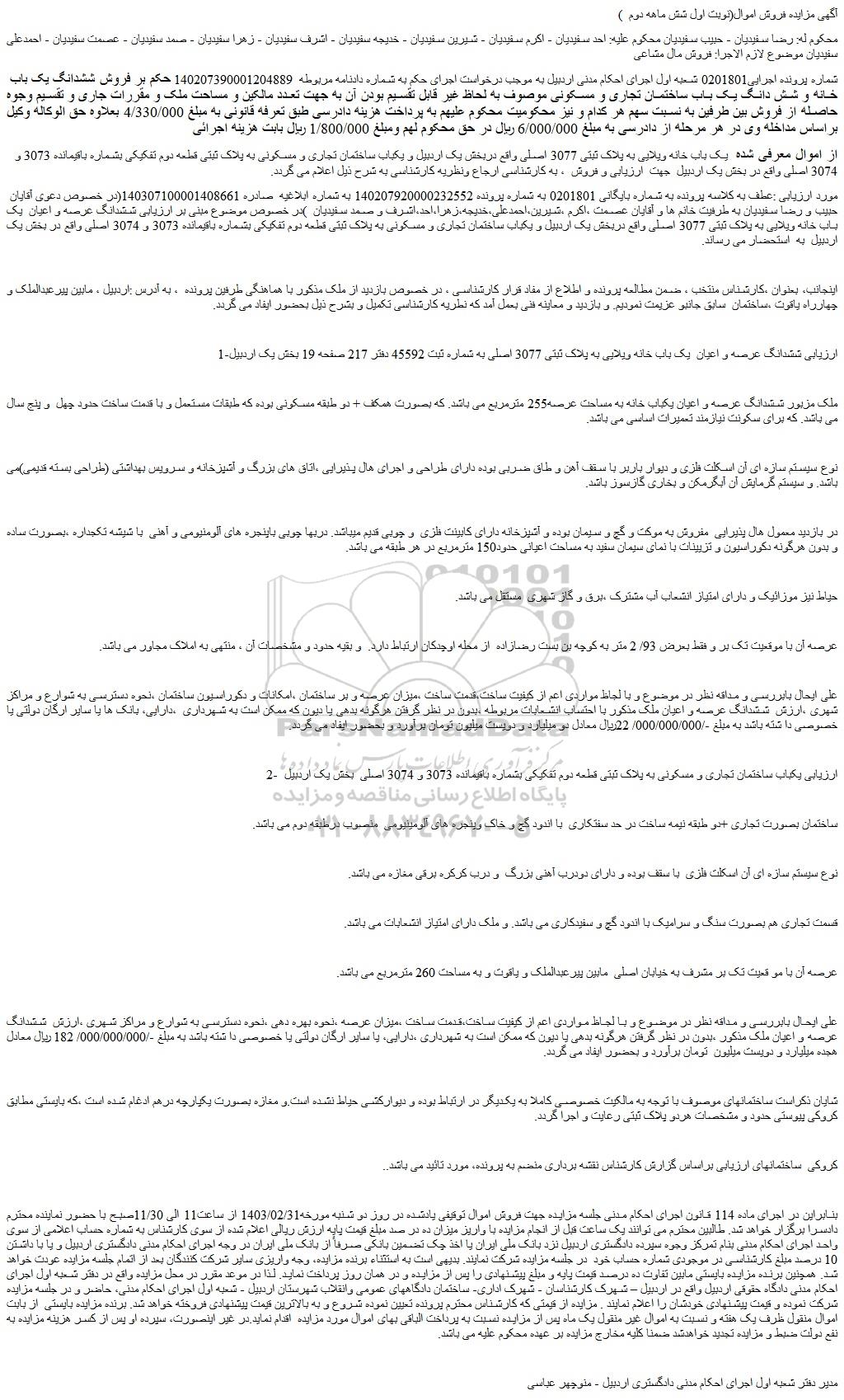 مورد ارزیابی :عطف به کلاسه پرونده به شماره بایگانی 0201801 به شماره پرونده 140207920000232552 به شماره ابلاغیه صادره 140307100001408661(در خصوص دعوی آقایان حبیب و رضا سفیدیان به طرفیت خانم ها و آقایان عصمت ،اکرم ،شیرین،احمدعلی،خدیجه،زهرا،احد،اشرف و صمد سفیدیان )در خصوص موضوع مبنی بر ارزیابی ششدانگ عرصه و اعیان یک باب خانه ویلایی به پلاک ثبتی 3077 اصلی واقع دربخش یک اردبیل و یکباب ساختمان تجاری و مسکونی به پلاک ثبتی قطعه دوم تفکیکی بشماره باقیمانده 3073 و 3074 اصلی واقع در بخش یک اردبیل به استحضار می رساند.