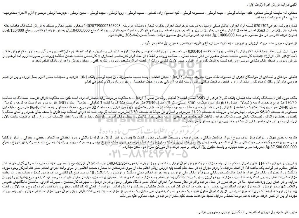شماره پرونده اجرایی0201302 شعبه اول اجرای احکام مدنی اردبیل به موجب درخواست اجرای حکم به شماره دادنامه مربوطه  140207390002365923 محکوم علیهم محکوم هستند به فروش ششدانگ یکباب خانه بشماره ثبتی 2فرعی از 3563 اصلی قطعه 2 تفکیکی واقع در بخش 2 اردبیل  و تقسیم بهای حاصله  بین ورثه و شرکای به نسبت سهم قانونی و پرداخت مبلغ 10/000/000ریال بعنوان هزینه کارشناسی و مبلغ 4/120/000ریال بعنوان هزینه دادرسی در حق محکوم له و مبلغ 1/800/000 ریال بابت نیم عشردولتی درحق صندوق دولت. ضمناً تبصره2ماده306 رعایت شود.