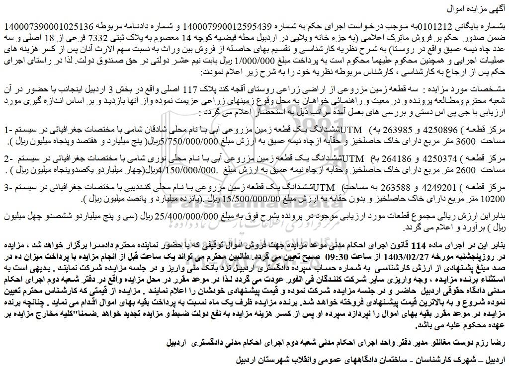 بشماره بایگانی 0101212به موجب درخواست اجرای حکم به شماره 140007990012595439 و شماره دادنامه مربوطه 140007390001025136 ضمن صدور  حکم بر فروش ماترک اعلامی (به جزء خانه ویلایی در اردبیل محله فیضیه کوچه 14 معصوم به پلاک ثبتی 7332 فرعی از 18 اصلی و سه عدد چاه نیمه عمیق واقع در روستا) به شرح نظریه کارشناسی و تقسیم بهای حاصله از فروش بین وراث به نسبت سهم الارث آنان پس از کسر هزینه های عملیات اجرایی و همچنین محکوم علیهما محکوم است به پرداخت مبلغ 1/000/000 ریال بابت نیم عشر دولتی در حق صندوق دولت. لذا در راستای اجرای حکم پس از ارجاع به کارشناسی ، کارشناس مربوطه نظریه خود را به شرح زیر اعلام نمودند: