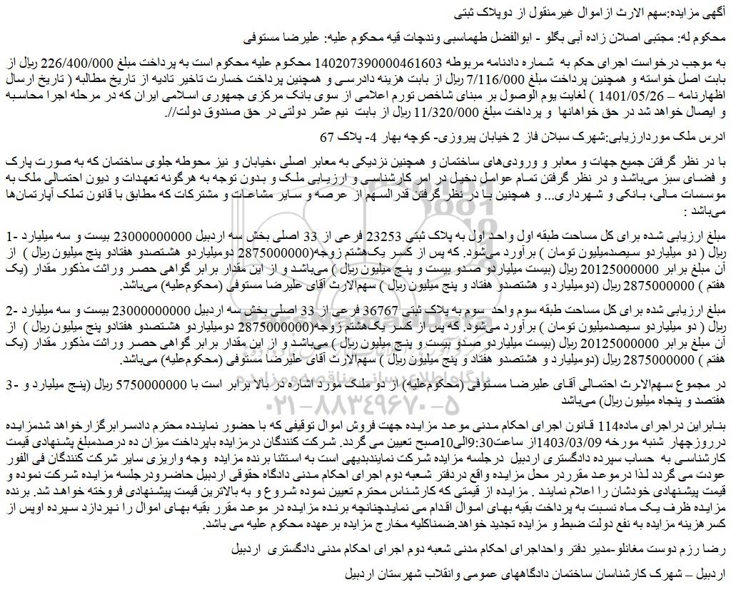 1 - مبلغ ارزیابی شده برای کل مساحت طبقه اول واحد اول به پلاک ثبتی 23253 فرعی از 33 اصلی بخش سه اردبیل 23000000000 بیست و سه میلیارد ریال ( دو میلیاردو سیصدمیلیون تومان ) برآورد می شود. که پس از کسر یک هشتم زوجه(2875000000 دومیلیاردو هشتصدو هفتادو پنج میلیون ریال )  از آن مبلغ برابر 20125000000 ریال (بیست میلیاردو صدو بیست و پنج میلیون ریال ) می باشد و از این مقدار برابر گواهی حصر وراثت مذکور مقدار (یک هفتم ) 2875000000 ریال (دومیلیارد و هشتصدو هفتاد و پنج میلیون ریال ) سهم الارث آقای علیرضا مستوفی (محکوم علیه) می باشد.