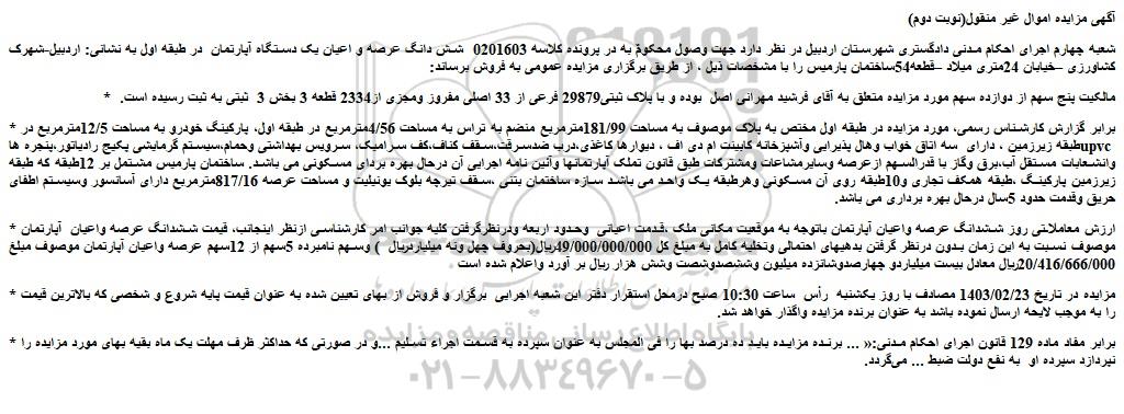 شعبه چهارم اجرای احکام مدنی دادگستری شهرستان اردبیل در نظر دارد جهت وصول محکومٌ به در پرونده کلاسه 0201603 شش دانگ عرصه و اعیان یک دستگاه آپارتمان در طبقه اول به نشانی: اردبیل-شهرک کشاورزی –خیابان 24متری میلاد –قطعه54ساختمان پارمیس را با مشخصات ذیل ، از طریق برگزاری مزایده عمومی به فروش برساند: