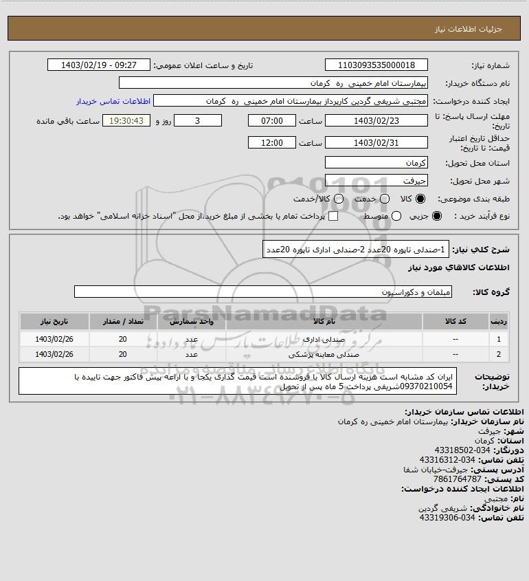شرح کلی نیاز: 1-صندلی تاپوره 20عدد 2-صندلی اداری تاپوره 20عدد