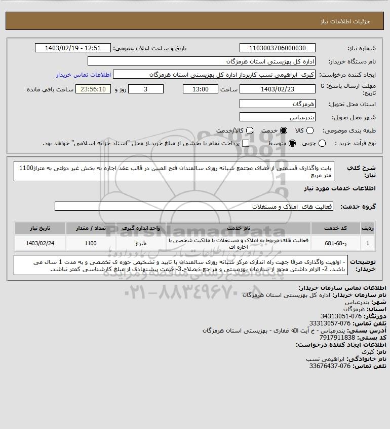 شرح کلی نیاز: بابت واگذاری قسمتی از فضای مجتمع شبانه روزی سالمندان فتح المبین در قالب عقد اجاره به بخش غیر دولتی به متراژ1100 متر مربع