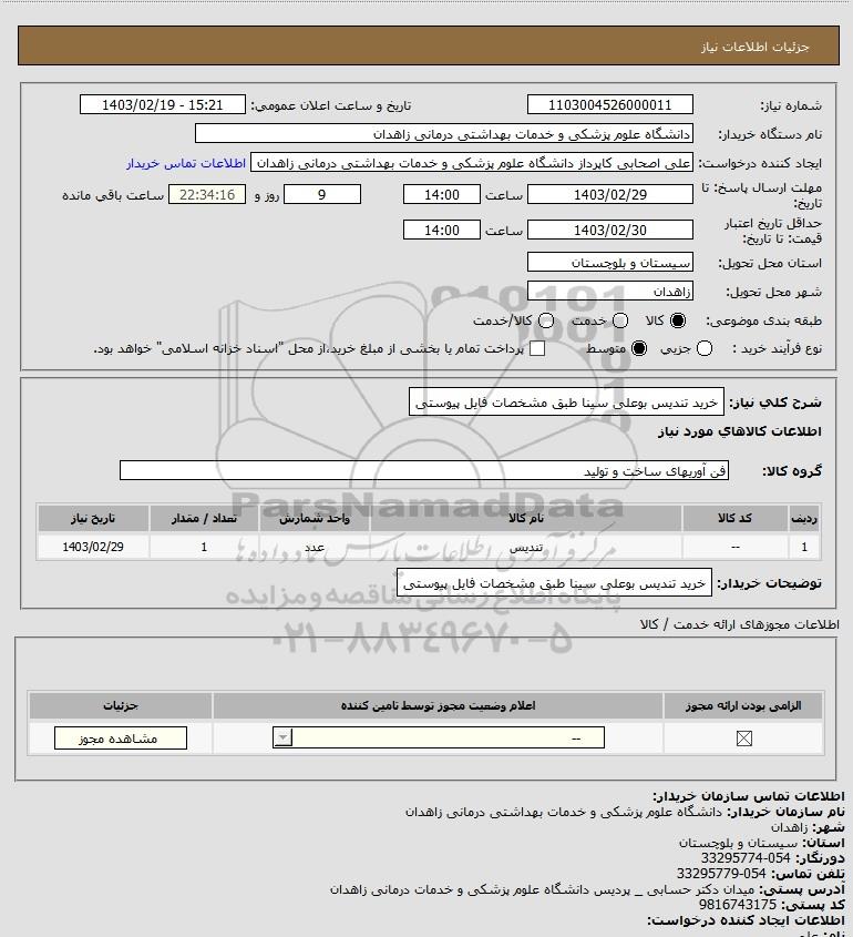 نام دستگاه خریدار:دانشگاه علوم پزشکی و خدمات بهداشتی درمانی زاهدان