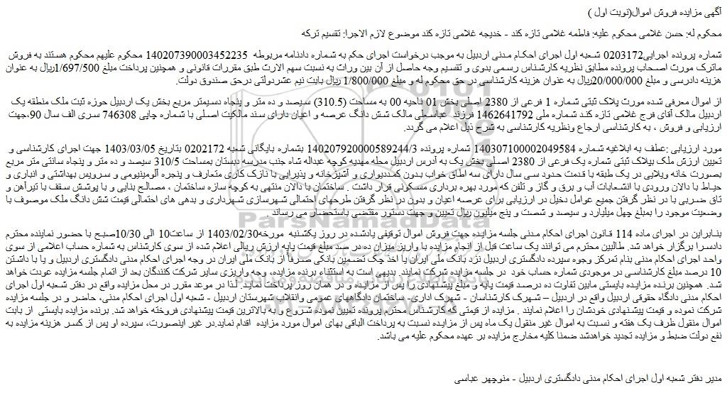 از اموال معرفی شده مورث پلاک ثبتی شماره 1 فرعی از 2380 اصلی بخش 01 ناحیه 00 به مساحت (310.5) سیصد و ده متر و پنجاه دسیمتر مربع بخش یک اردبیل حوزه ثبت ملک منطقه یک اردبیل مالک آقای فرج غلامی تازه کند شماره ملی 1462641792 فرزند عباسعلی مالک شش دانگ عرصه و اعیان دارای سند مالکیت اصلی با شماره چاپی 746308 سری الف سال 90،جهت ارزیابی و فروش ، به کارشناسی ارجاع ونظریه کارشناسی به شرح ذیل اعلام می گردد.