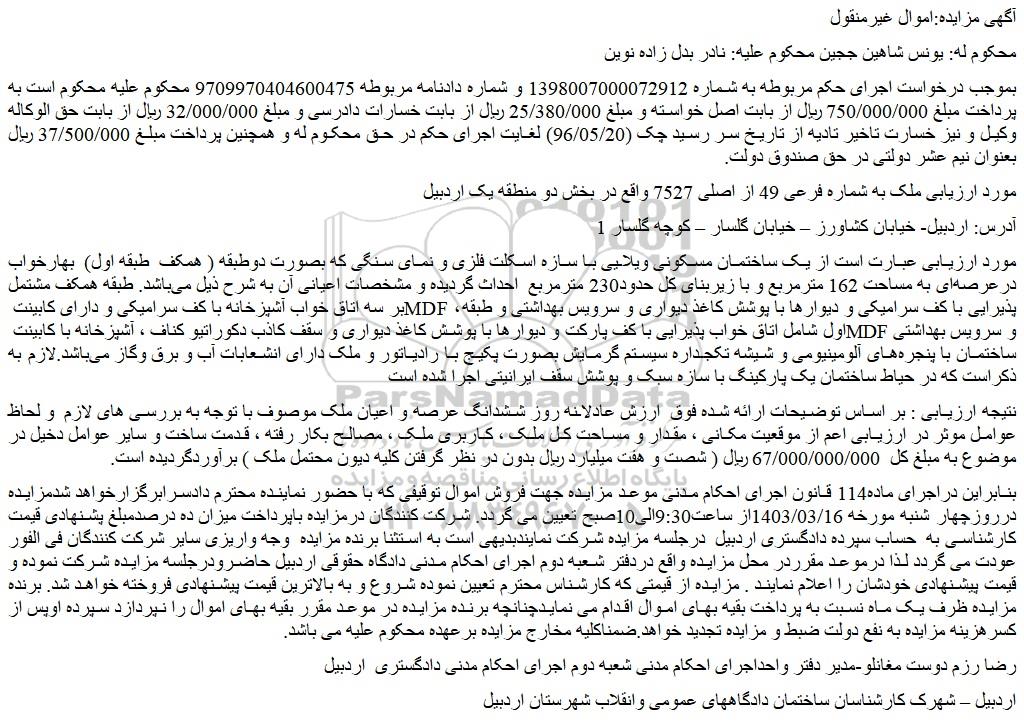 مورد ارزیابی ملک به شماره فرعی 49 از اصلی 7527 واقع در بخش دو منطقه یک اردبیل
