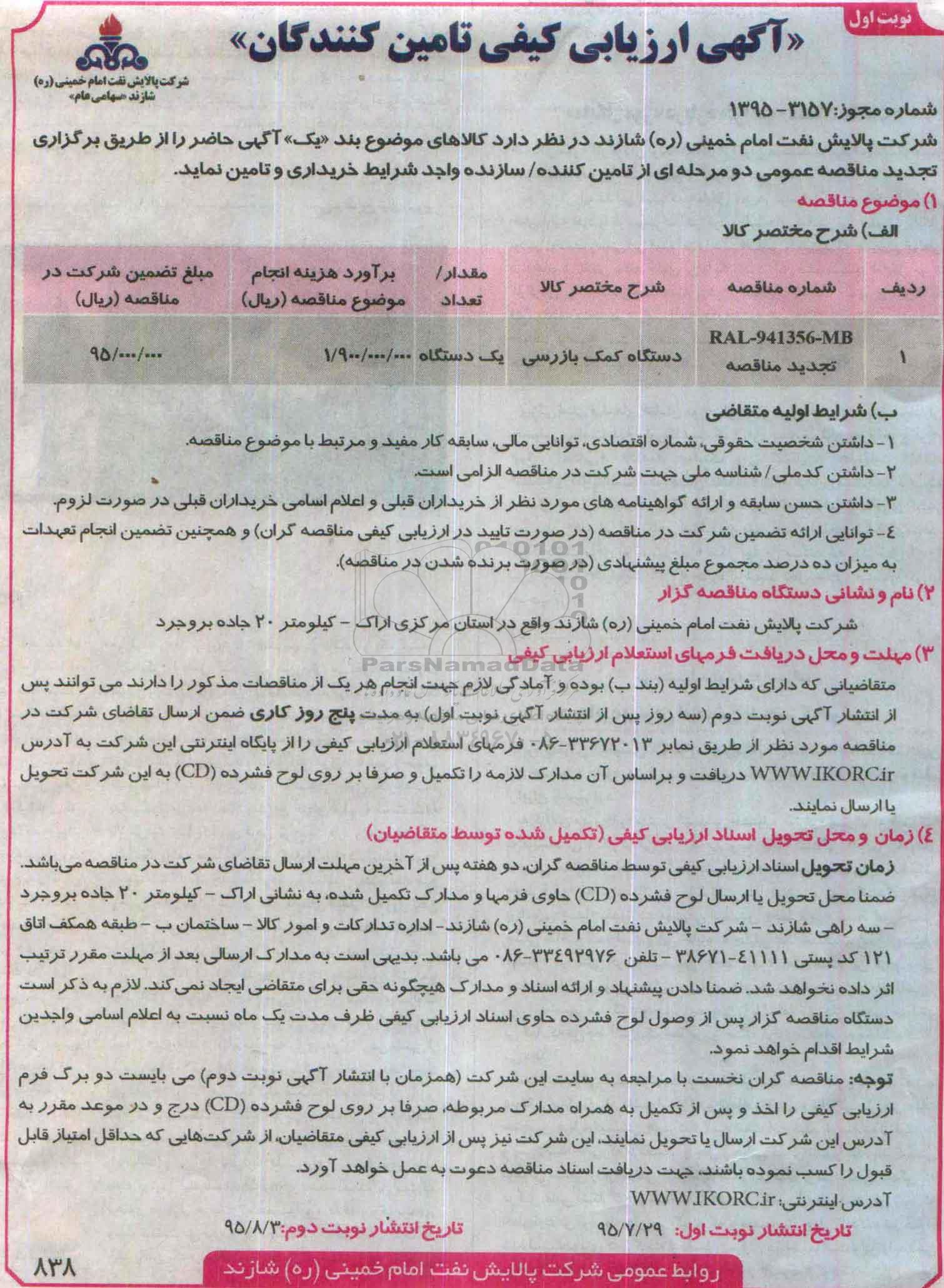 تجدید ارزیابی کیفی دستگاه کمک بازرسی از کلیه افراد متخصص و شرکتها واجد شرایط دعوت به عمل میآید در مناقصه با کد خبرگزاری پارس نماد: 740973 شرکت نمایند.