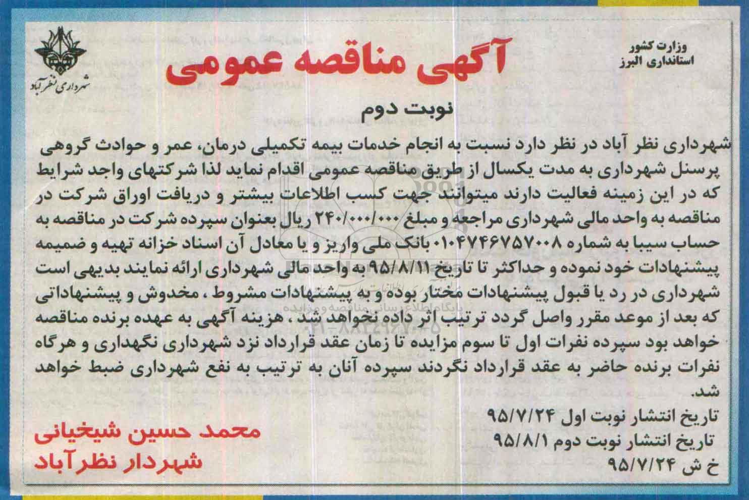 شهرداری نظرآباد درنظردارد نسبت به انجام خدمات بیمه تکمیلی درمان ، عمر و حوادث گروهی پرسنل شهرداری به مدت یک سال از طریق مناقصه عمومی اقدام نمایند لذا شرکتهای واجد شرایط که در این زمینه فعالیت دارند می توانند جهت کسب اطلاعات بیشتر و دریافت اوراق شرکت در مناقصه به واحد امور مالی شهرداری مراجعه و مبلغ 240.000.000 ریال بعنوان سپرده شرکت در مناقصه به حساب سیبا به شماره 0104746757008 بانک ملی واریز و یا معادل آن اسناد خزانه تهیه و ضمیمه پیشنهادات خود نموده و حداکثر تا تاریخ 95.8.11 به واحد مالی شهرداری ارائه نمایند بدیهی است شهرداری در رد یا قبول پیشنهادات مختار بوده و به پیشنهادات مشروط مخدوش و پیشنهاداتی که بعد از موعد مقرر واصل گردد ترتیب اثر داده نخواهد شد