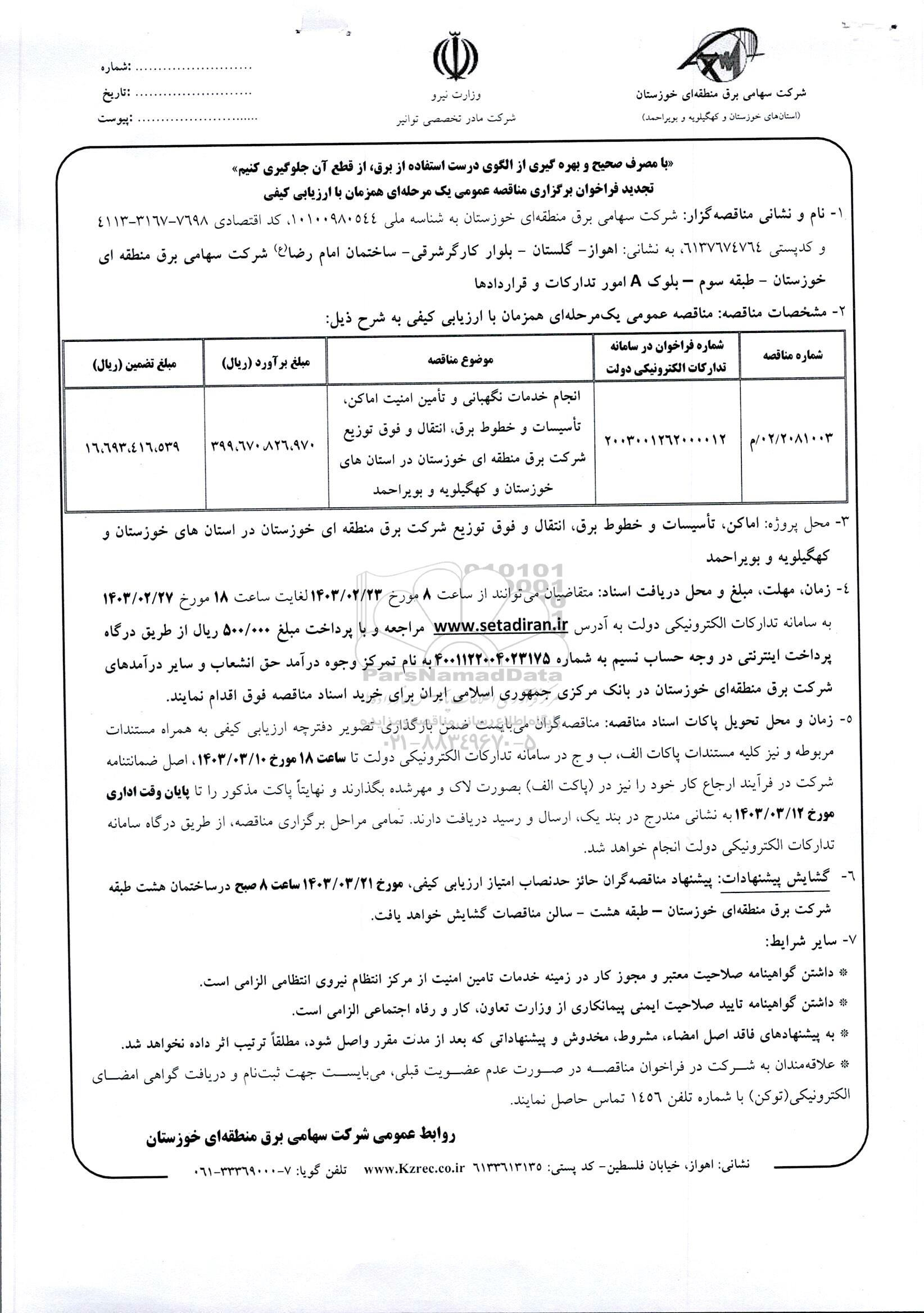02/2081003/ م  2003001262000012 انجام خدمات نگهبانی و تامین امنیت اماکن، تاسیسات و خطوط برق، انتقال و فوق توزیع شرکت برق منطقه ای خوزستان در استان های خوزستان و کهگیلویه و بویراحمد 399.670.826.970 16.693.416.539