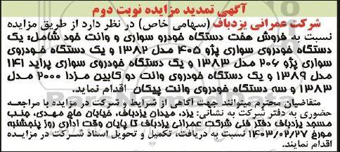 شرکت عمرانی یزدباف (سهامی خاص) در نظر دارد از طریق مزایده نسبت به فروش هفت دستگاه خودرو سواری و وانت خود شامل: یک دستگاه خودروی سواری پژو 405 مدل 1382 و یک دستگاه خودروی سواری پژو 206 مدل 1383 و یک دستگاه خودروی سواری پراید 141 مدل 1389 و یک دستگاه خودروی وانت دو کابین مزدا 2000 مدل 1383 و سه دستگاه خودروی وانت پیکان اقدام نماید.
