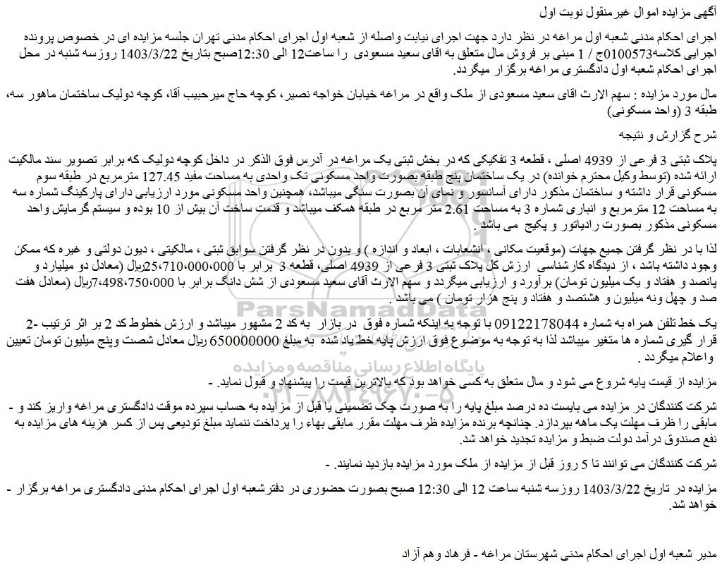 اجرای احکام مدنی شعبه اول مراغه در نظر دارد جهت اجرای نیابت واصله از شعبه اول اجرای احکام مدنی تهران جلسه مزایده ای در خصوص پرونده اجرایی کلاسه0100573ج / 1 مبنی بر فروش مال متعلق به اقای سعید مسعودی را ساعت12 الی 12:30صبح بتاریخ 1403/3/22 روزسه شنبه در محل اجرای احکام شعبه اول دادگستری مراغه برگزار میگردد.