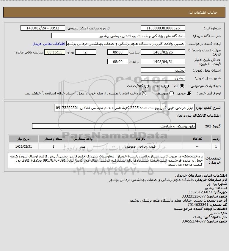 شرح کلی نیاز: ابزار جراحی طبق فایل پیوست شده 2225