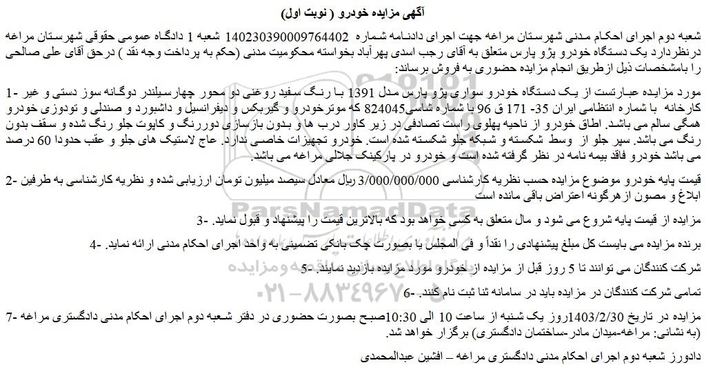 شعبه دوم اجرای احکام مدنی شهرستان مراغه جهت اجرای دادنامه شماره 140230390009764402 شعبه 1 دادگاه عمومی حقوقی شهرستان مراغه درنظردارد یک دستگاه خودرو پژو پارس متعلق به آقای رجب اسدی پهرآباد بخواسته محکومیت مدنی (حکم به پرداخت وجه نقد ) درحق آقای علی صالحی را بامشخصات ذیل ازطریق انجام مزایده حضوری به فروش برساند: