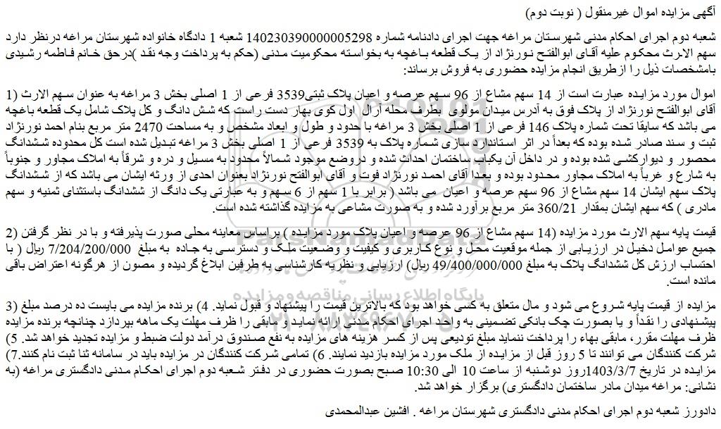 1) اموال مورد مزایده عبارت است از 14 سهم مشاع از 96 سهم عرصه و اعیان پلاک ثبتی3539 فرعی از 1 اصلی بخش 3 مراغه به عنوان سهم الارث آقای ابوالفتح نورنژاد از پلاک فوق به آدرس میدان مولوی  بطرف محله آرال  اول کوی بهار دست راست که شش دانگ و کل پلاک شامل یک قطعه باغچه می باشد که سایقا تحت شماره پلاک 146 فرعی از 1 اصلی بخش 3 مراغه با حدود و طول و ابعاد مشخص و به مساحت 2470 متر مربع بنام احمد نورنژاد ثبت و سند صادر شده بوده که بعداً در اثر استاندارد سازی شماره پلاک به 3539 فرعی از 1 اصلی بخش 3 مراغه تبدیل شده است کل محدوده ششدانگ محصور و دیوارکشی شده بوده و در داخل آن یکباب ساختمان احداث شده و دروضع موجود شمالاً محدود به مسیل و دره و شرقاً به املاک مجاور و جنوباً به شارع و غرباً به املاک مجاور محدود بوده و بعدا آقای احمد نورنژاد فوت و آقای ابوالفتح نورنژاد بعنوان احدی از ورثه ایشان می باشد که از ششدانگ پلاک سهم ایشان 14 سهم مشاع از 96 سهم عرصه و اعیان  می باشد ( برابر با 1 سهم از 6 سهم و به عبارتی یک دانگ از ششدانگ باستثنای ثمنیه و سهم مادری ) که سهم ایشان بمقدار 360/21 متر مربع برآورد شده و به صورت مشاعی به مزایده گذاشته شده است.