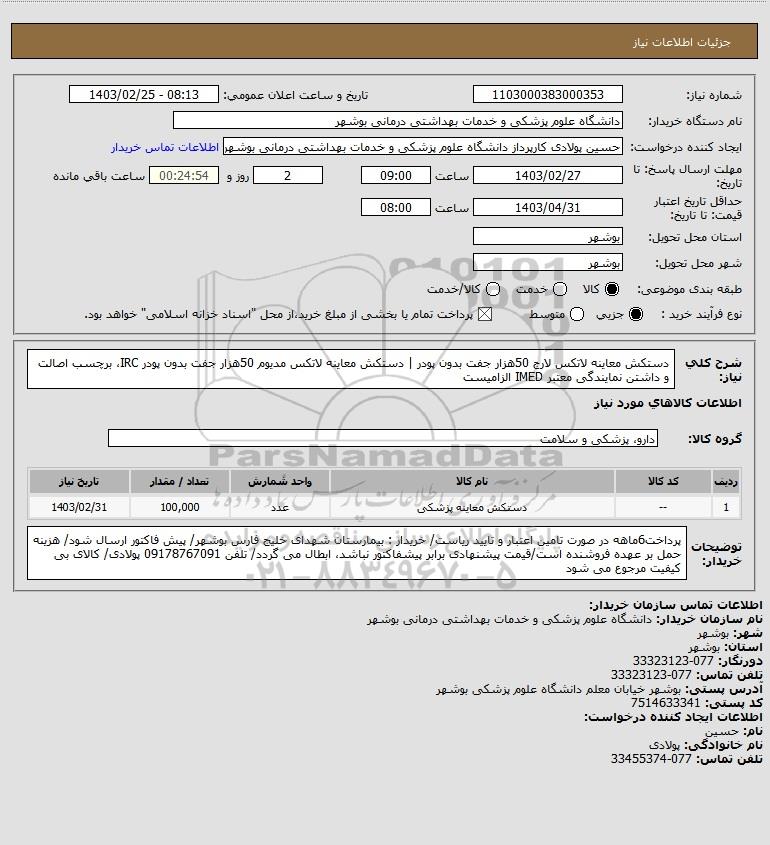 شرح کلی نیاز: دستکش معاینه لاتکس لارج 50هزار جفت بدون پودر | دستکش معاینه لاتکس مدیوم 50هزار جفت بدون پودر IRC، برچسب اصالت و داشتن نمایندگی معتبر IMED الزامیست