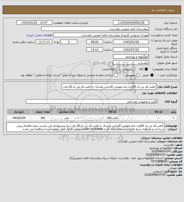 | 1 | -- | لامپ LED | عدد | 200 | 1403/02/29 |