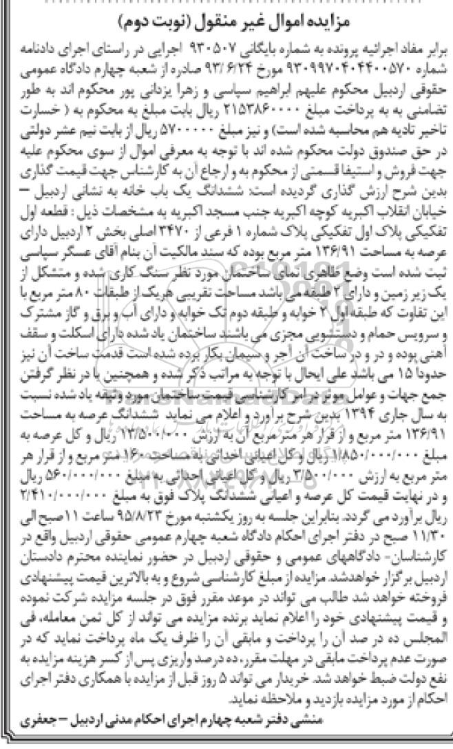 مزایده ششدانگ یکباب خانه به شماره بایگانی 930507 نوبت دوم , مزایده,مزایده ششدانگ یکباب خانه به شماره بایگانی 930507 نوبت دوم