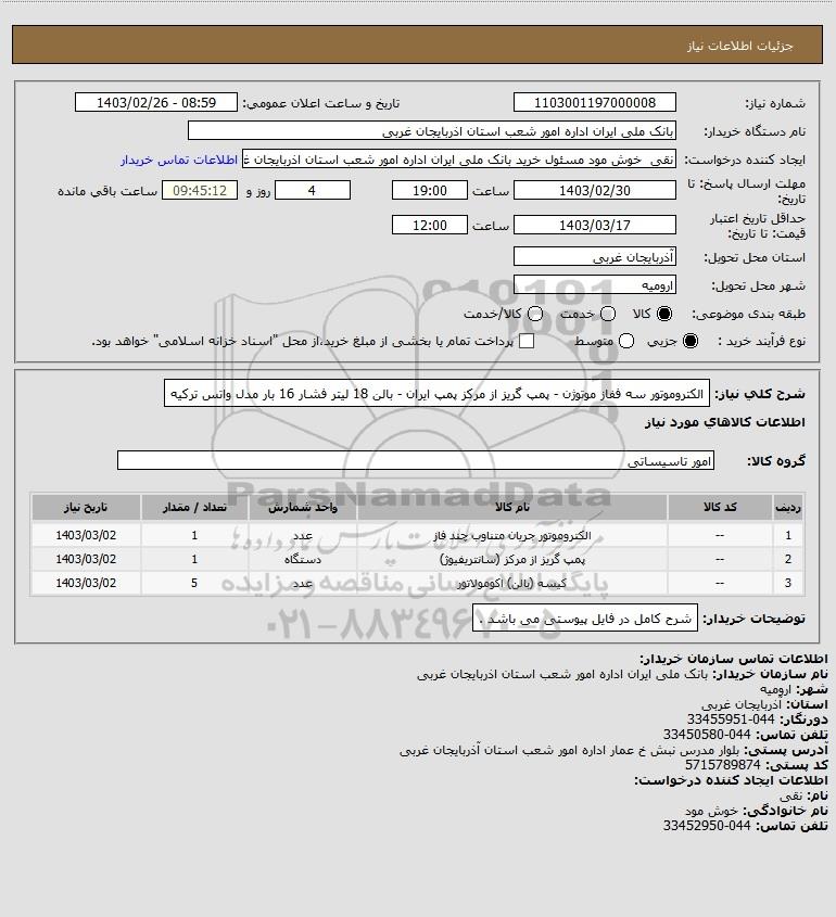 شرح کلی نیاز: الکتروموتور سه ففاز موتوژن - پمپ گریز از مرکز پمپ ایران - بالن 18 لیتر فشار 16 بار مدل واتس ترکیه